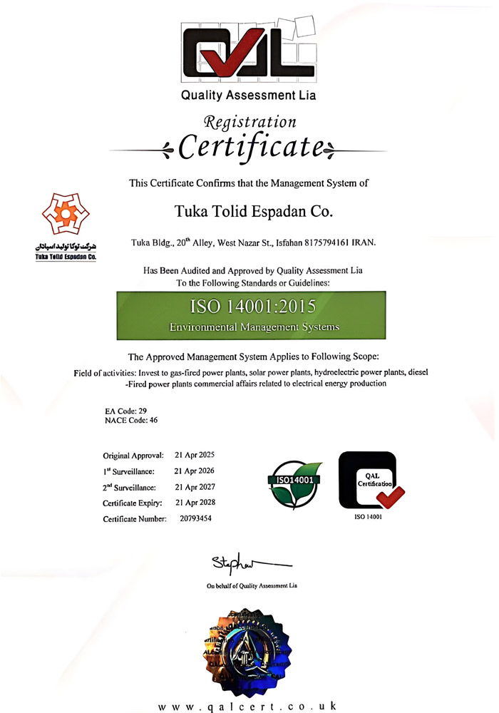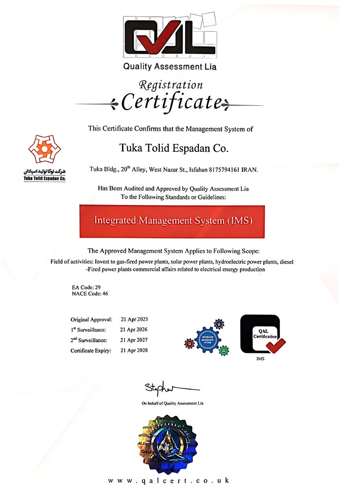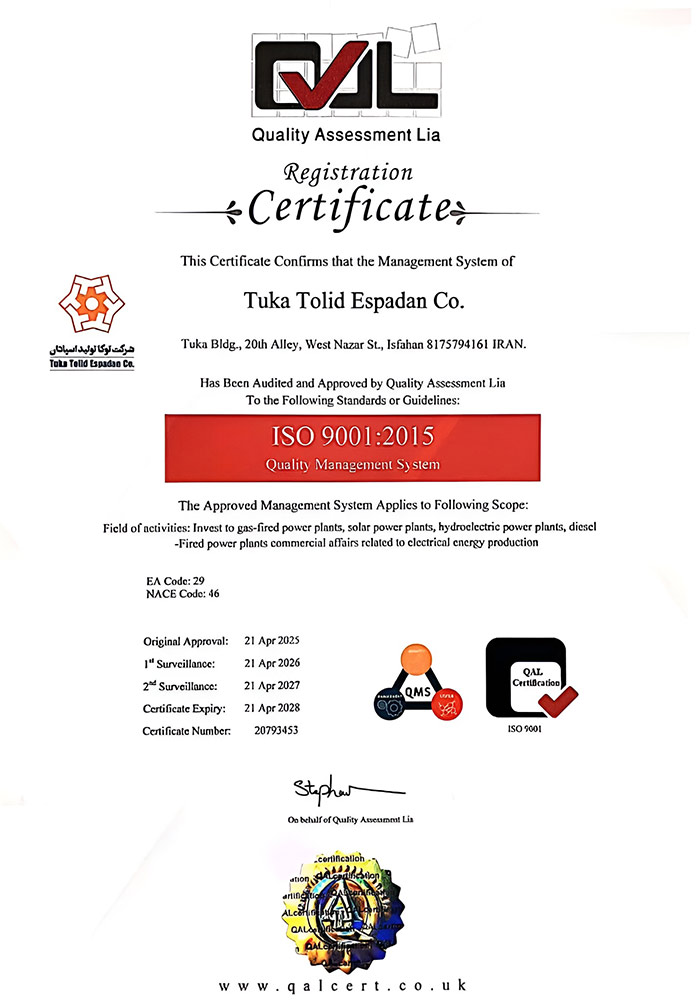 شرکت توکا تولید اسپادان (سهامی خاص) با ظرفیت اسمی 16 مگاوات در ساعت، بهعنوان یکی از نیروگاه های مقیاس کوچک فعال و قابلاعتماد در صنعت تولید برق در استان اصفهان شناخته میشود. این شرکت با بهرهگیری از تیمی متخصص، توانسته است نقش مهمی در تأمین انرژی قابل اطمینان و پایدار برای منطقه ایفا کند.